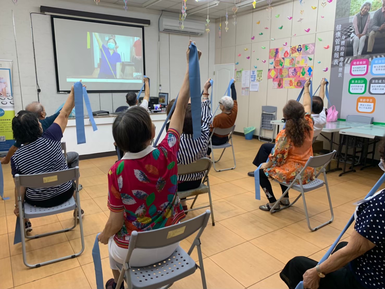 透過遠距教學的方式,請到彰基復健科復健師指導虎尾惠生大藥局的民眾進行彈力帶課程